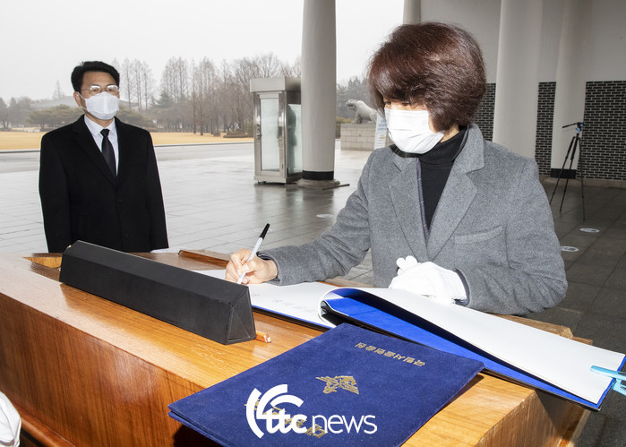 | ▲ 취임식에 앞서 한정애 장관은 국립서울현충원을 방문하여 현충탑에 참배하고 방명록에 “푸른 하늘 맑은 물, 모두를 위한 환경복지, 미래를 위한 환경정책을 만들어 가겠습니다.”는 다짐을 남겼다.(사진=환경부 제공) |