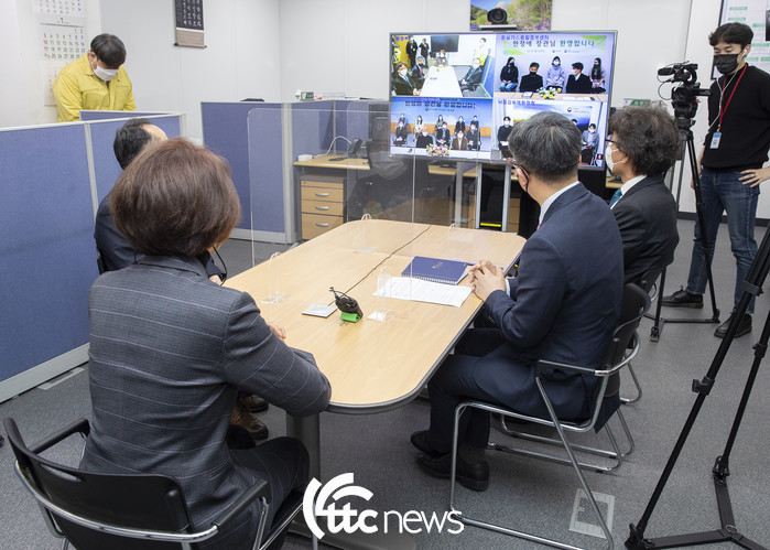 | ▲ 이날 한정애 장관은 취임식 직후 환경부 미세먼지 상황실에서 온실가스종합정보센터, 국가미세먼지정보센터, 낙동강유역환경청 등 소속기관 직원과의 대화를 온라인 영상으로 진행하였다. 미세먼지 상황실 직원 격려로 시작된 이 자리에서, 소속기관 직원들은 신임 장관께 바라는 사항 등을 전했으며, 한정애 장관은 고생하는 직원들에게 감사의 인사를 전하면서 미세먼지 저감과 탄소중립 전환의 중요성을 강조하였다. (사진=환경부 제공) |