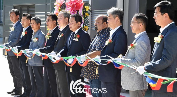 | ▲ 29일 오후 전남 진도군 고군면에서 사진 왼쪽에서 다섯 번째 부터 (주)한창 최승환 대표, (주)에이치씨알 조상태 대표 등 내빈이 자원순환센터 개소 기념 테이프를 절단하고 있다 |