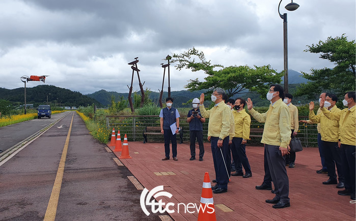 | ▲ 박재현 한국수자원공사 사장(앞줄 가운데)이 지난 3일 전남 화순군 화순홍수조절지를 방문하여, 드론을 활용한 원격 안전점검을 진행하고 있다. 수자원공사는 금년부터 드론을 활용한 스마트 댐 안전관리체계를 본격 가동중에 있다. |