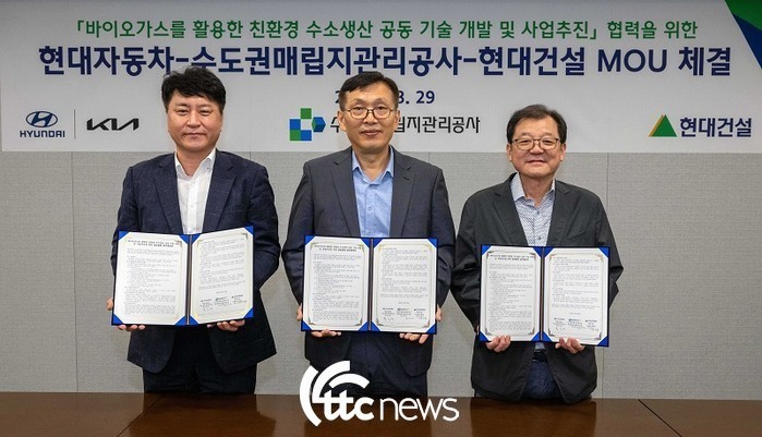 수도권매립지관리공사는 29일 서울시 종로구 현대건설 사옥에서 현대차·기아, 현대건설 등과 ‘바이오가스를 활용한 친환경 수소생산 공동기술 개발 및 사업추진을 위한 업무협약’을 체결했다.