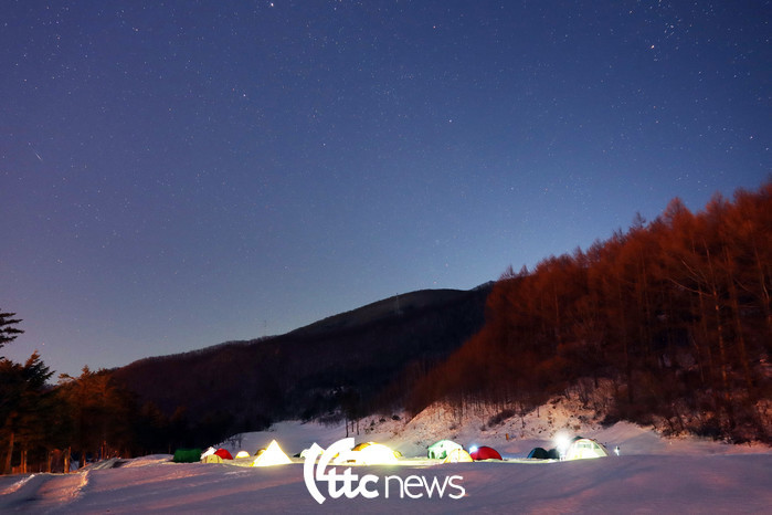 코로나19의 재확산 속에 휴일을 맞은 19일 하이원 리조트가 진행하는 ‘동계 하늘길 챌린지'에 참가한 한 백패커들이 하이원골프장의 눈덮힌 필드에 마련된 야영지에서 수 많은 별들을 감상하며 동계야영을 즐기고 있다.