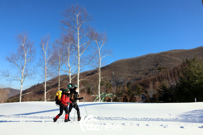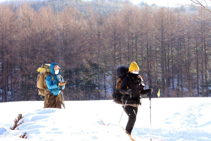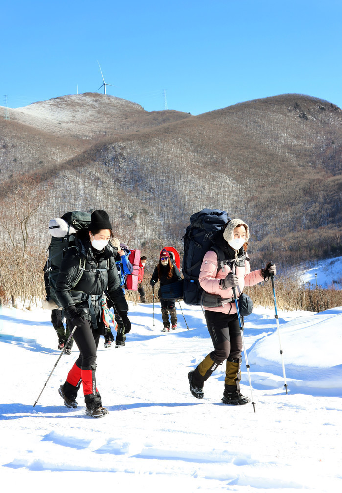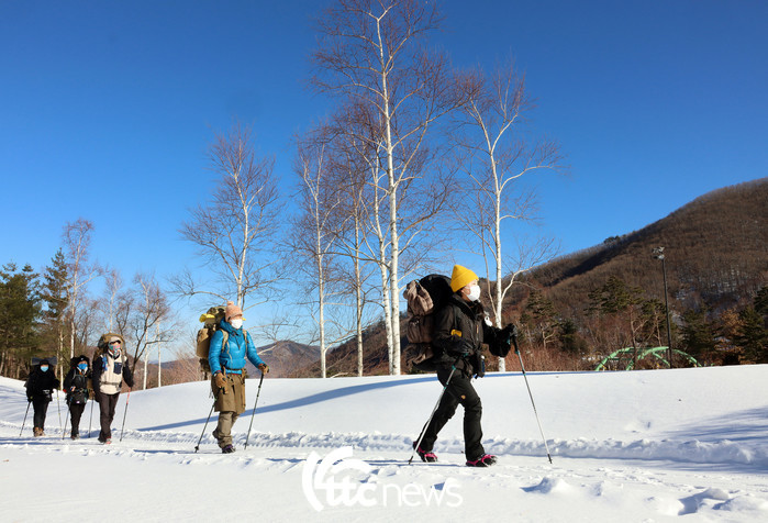 | ▲ 코로나19의 재확산 속에 휴일을 맞아 하이원 리조트가 진행하는 ‘동계 하늘길 챌린지'에 참가한 한 백패커들이 눈덮힌 설원을 트래킹하고 있다.(사진=하이원리조트 제공) |