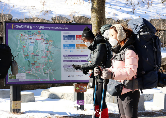 | ▲ 코로나19의 재확산 속에 휴일을 맞아 하이원 리조트가 진행하는 ‘동계 하늘길 챌린지'에 참가한 한 백패커들이 트래킹코스를 확인하고 있다.(사진=하이원리조트 제공) |