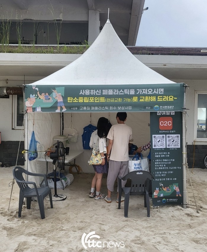 이호 해수욕장 해변 일대에는‘폐투명페트병 새활용 파라솔’이 설치되어 더위에 지친 해수욕장 방문객들이 이용하였으며, 한국환경공단, 제주시니어클럽 등 협업기관들이 탄소저감 실천방안에 관심을 가질 수 있도록 폐병뚜껑 및 커피찌꺼기를 재활용한 자원순환 체험 부스도 함께 운영하였다.