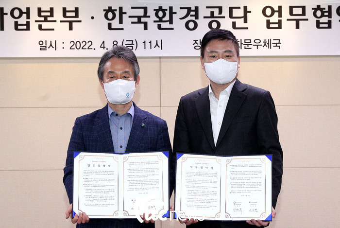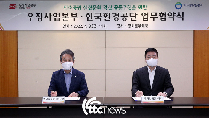 한국환경공단 안병옥 이사장은 8일, 우정사업본부 손승현 본부장과 “2050 탄소중립” 실천문화 확산을 위한 업무 협약을 체결했다.