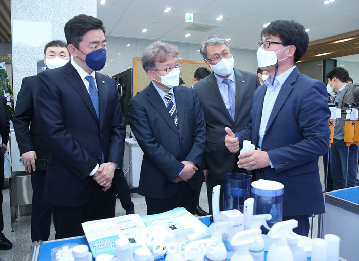 | ▲ 29일 수자원공사는 물분야 유망기업의 성장을 지원하고 물산업 혁신 생태계 조성하기 위한 ‘2021 대한민국 물산업 투자 콘퍼런스’를 개최 하고 ‘충청 지역뉴딜 벤처펀드’ 조성과 벤처투자 활성화를 위한 업무협약을 체결했다. 또, 부대행사로 벤처캐피털 5개사를 초청하여 물산업 스타트업의 투자유치 지원을 위한 투자상담회와 홍보부스 운영도 진행했다. 사진은 물산업 스타트업 관계자(오른쪽)으로부터 강준현 의원, 권칠승 중소벤처기업부 장관, 박재현 수자원공사 사장(사진 왼쪽부터)이 사업 설명을 청취하고 있다.(사진=한국수자원공사 제공) |