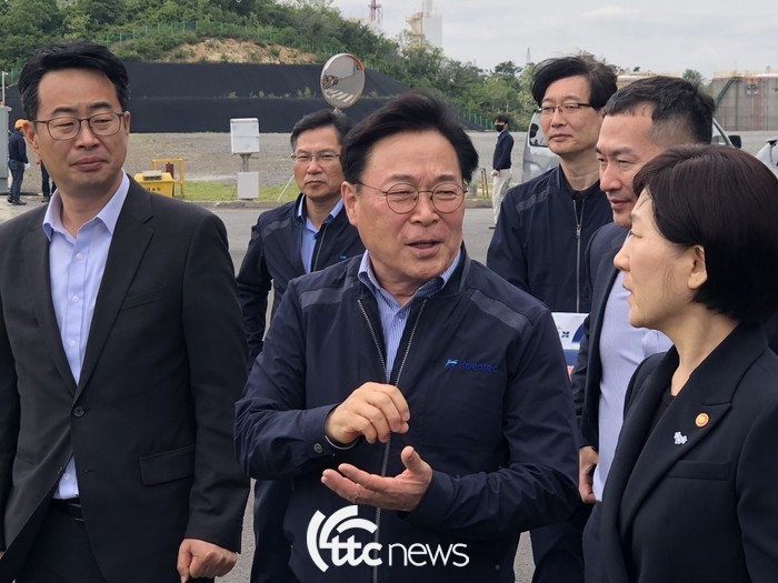 | ▲ 울산시 산업폐기물 소각·매립시설 ㈜코엔텍을 방문한 한화진 환경부 장관이 상부토지 활성화에 대해 제도개선을 약속했다.(사진= 한국산업폐기물매립협회 제공) |