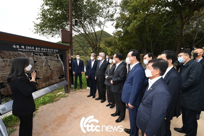 김부겸 국무총리는 29일 “소중한 우리 문화재인 반구대 암각화가 더 이상 물에 잠기지 않도록 대책 마련하고, 유네스코 세계유산에 등재되어 세계인이 찾는 명소로 거듭나길 기대한다”고 말했다.