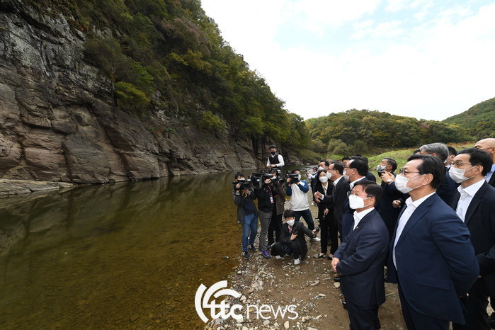 | ▲ 김부겸 총리는 10월 29일, 울산 암각화 박물관에서 제135회 국정현안점검조정회의를 주재한 후 암각화 현장을 찾아 설명을 듣고 있다. 앞줄 왼쪽 두번째 부터 박재현 한국수자원공사 사장, 이상헌 국회의원, 한정애 환경부 장관, 김부겸 총리, 송철호 울산시장, 김현모 문화재청장 |