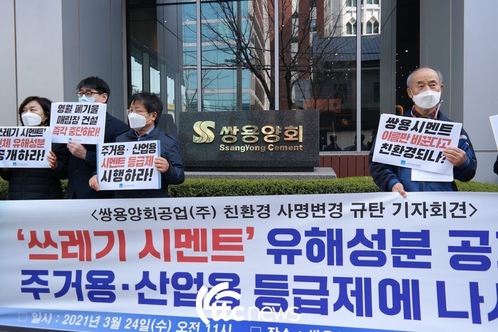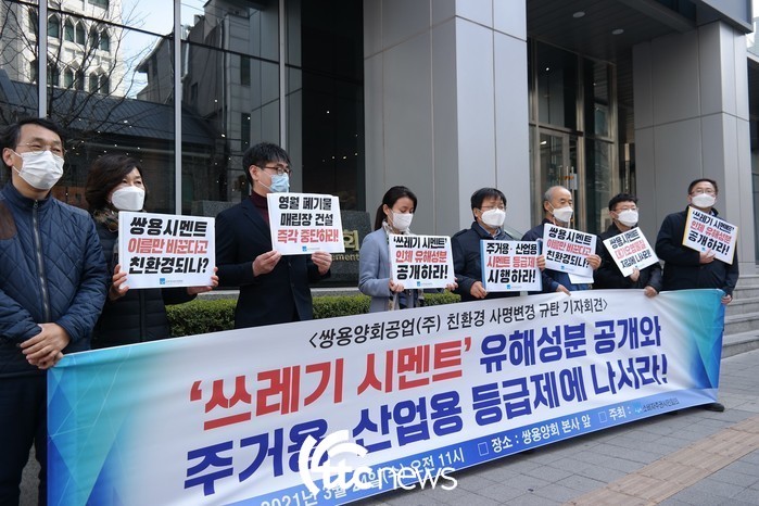 | ▲ ‘소비자주권시민회의’는 24일, 쌍용양회 본사 앞에서 “쌍용양회의 친환경 사명변경 규탄기자회견을 열고 “‘쓰레기 시멘트’ 유해성분 공개와 주거용·산업용 등급제에 나서라!”고 주장했다. 또, 소비자주권은 '소비자주권'은 쌍용양회가 영월에 추진 중인 대규모 폐기물 매립장 중단하고, 원상 복구할 것도 촉구했다. |