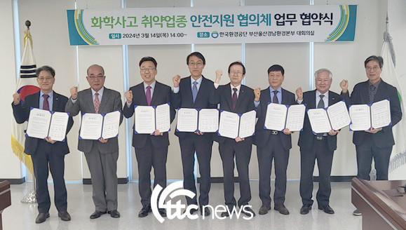 한국환경공단 부산울산경남환경본부(본부장 안병용)와 낙동강유역환경청(청장 최종원)은 14일 환경공단 부울경환경본부에서 부산광역시 사하구청, 부산지역 표면처리 및 염색업종 협동조합 등 총 8개 기관과 화학 사고 취약업종 안전지원 협의체 업무협약을 체결했다.