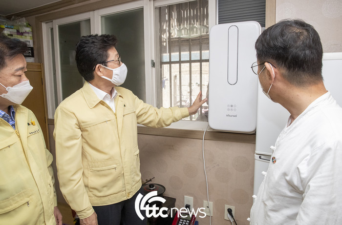 | ▲ 조명래 환경부 장관(가운데)이 3일 박승원 광명시장(왼쪽)과 함께 기후행동 캠페인으로 취약계층 가구에 설치한 창문형 냉방기기를 살피고 있다.(사진=왕보현 기자) |