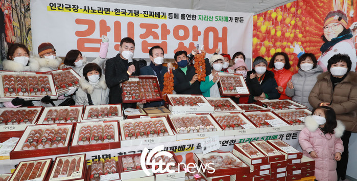 | ▲ 8일 경남 함양군 상림공원 일원에서 열린 함양곶감 특판행사에서 서춘수 함양군수(왼쪽에서 여섯 번째)와 곶감 농가들이 고종시곶감을 홍보하고 있다.(사진=함양군 김용만 주무관 제공) |