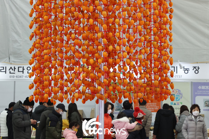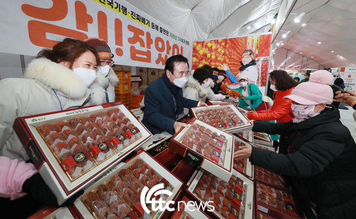 8일 경남 함양군 상림공원 일원에서 열린 함양곶감 특판행사에서 서춘수 함양군수와 곶감 농가들이 고종시곶감을 홍보하고 있다.