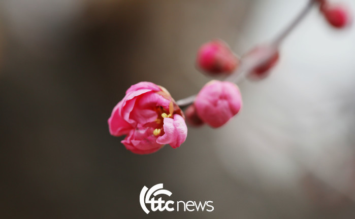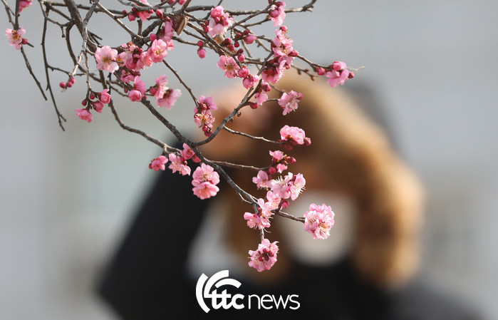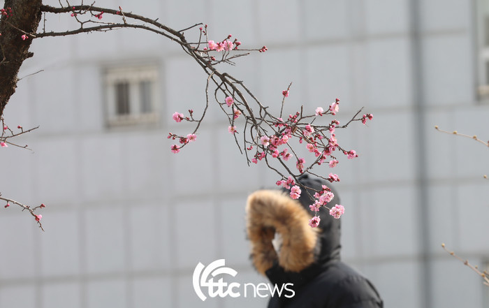 | ▲ 15일 오후 경남 함양군 함양읍 한 주택의 담 넘어 홍매화가 강한 찬바람을 이기며 꽃망울을 터뜨렸다.(사진=함양군 김용만 주무관 제공) |