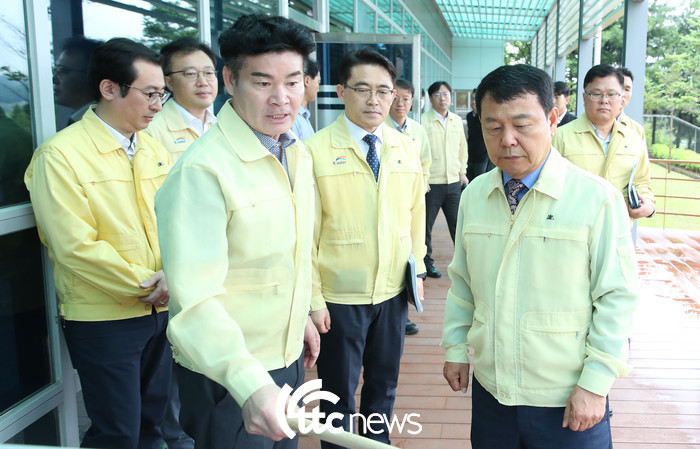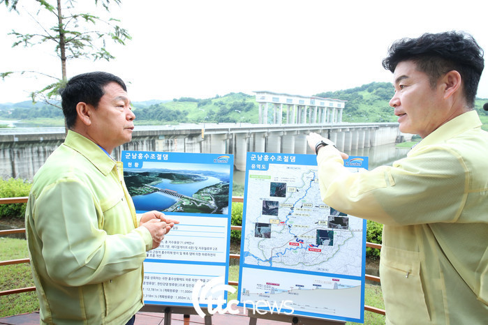 | ▲ 윤석대 한국수자원공사 사장(오른쪽)이 26일 경기도 연천군 군남댐을 방문해 접경지역 홍수기 댐 운영계획을 보고 받고 홍수대응 태세를 종합적으로 점검하고 있다.(사진=한국수자원공사 제공) |