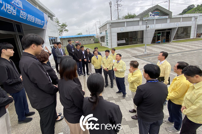 | ▲ 윤석대 한국수자원공사 사장(뒷모습)이 26일 경기도 연천군 군남댐을 방문해 물관리 최일선에서 홍수대응을 위해 노력 중인 직원들을 격려하고 철저한 시설관리와 방재근무를 당부하며 홍수피해 예방에 최선의 노력을 다해줄 것을 당부하고 있다.(사진=한국수자원공사 제공) |