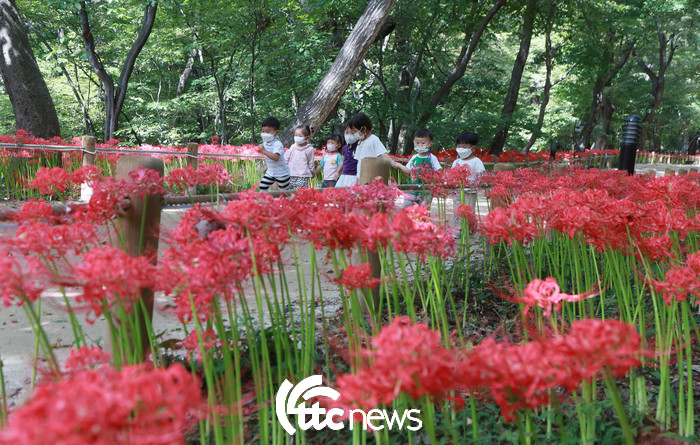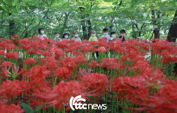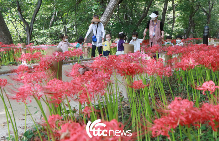 | ▲ 15일 경남 함양군 상림공원을 찾은 어린이들이 활짝 핀 꽃무릇 길에서 즐거운 모습으로 산책하고 있다. (사진=함양군 김용만 주무관 제공) |