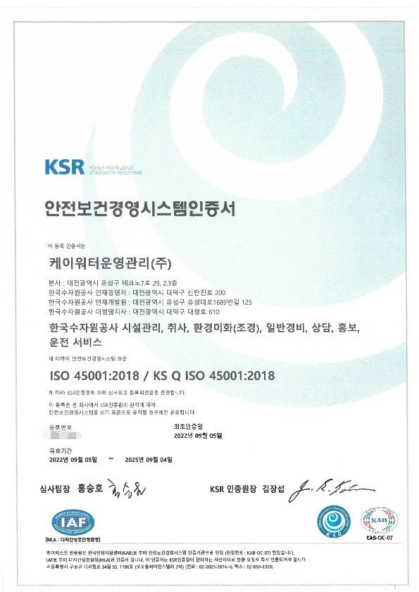 | ▲ K-water운영관리(주)는 안전보건경영시스템(ISO45001)인증을 통해 중대재해 예방의 초석을 마련하게 되었다. |