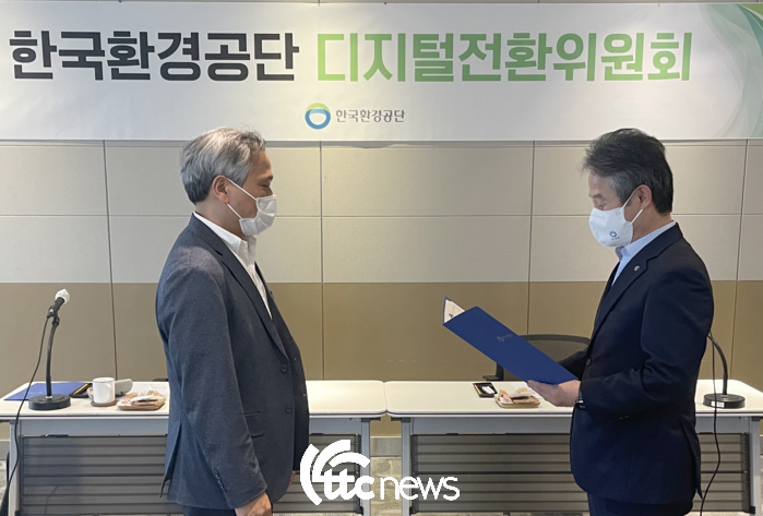 | ▲ 한국환경공단은 지난 24 중소기업DMC타워(서울 상암동)에서 한국환경공단 디지털전환위원회 제1차 회의를 열고 안병옥 이사장(우측)이 세종대학교 전자정보통신공학과 김재호 교수(좌측)에게 위촉장을 수여하고 있다.(사진=한국환경공단 제공) |