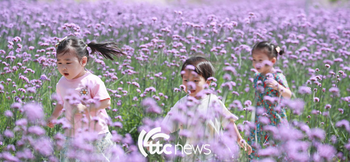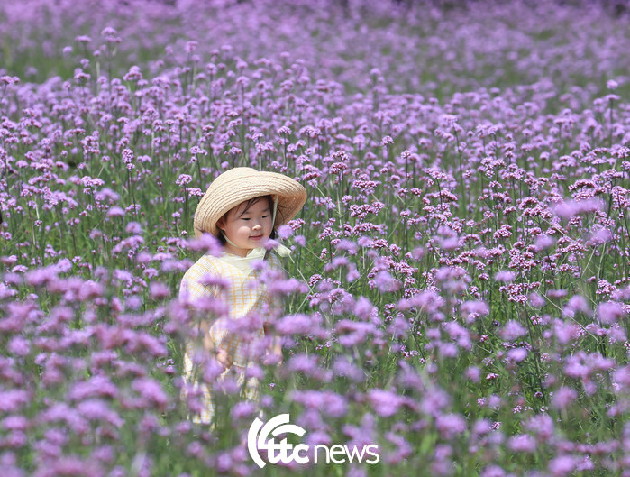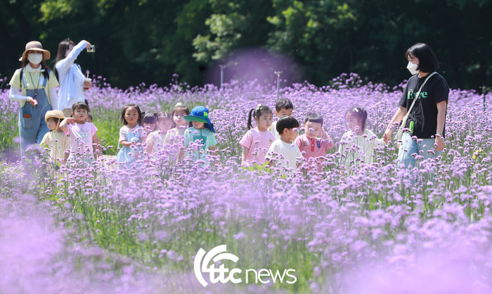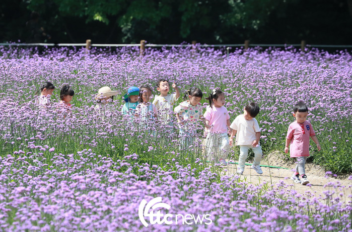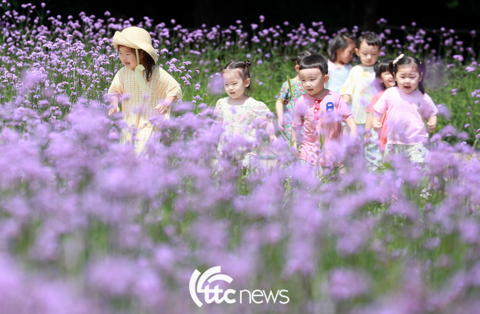 16일 경남 함양군 함양읍 상림공원 꽃밭에서 보랏빛 버들마편초가 활짝 펴 연꽃어린이집 원생들이 즐거운 시간을 보내고 있다.