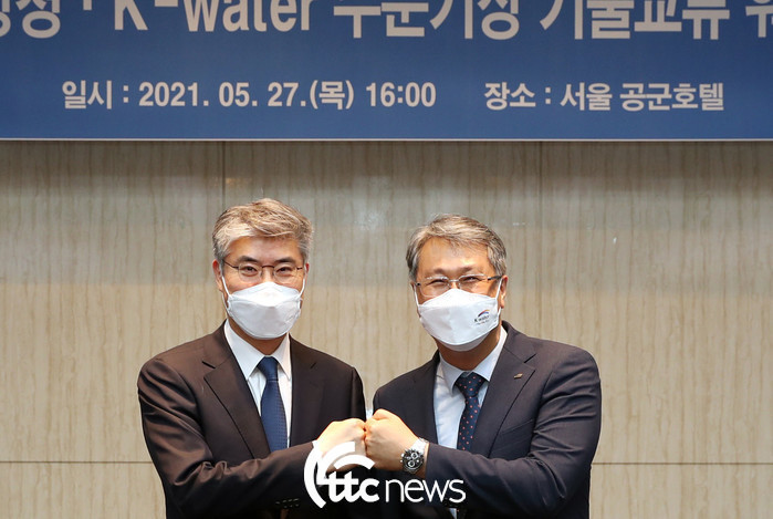 | ▲ 박광석 기상청장(왼쪽)과 박재현 한국수자원공사 사장이 27일 서울 영등포구 공군호텔에서 기상과 물관리 분야의 상호 기술협력 강화를 위한 ‘기상청·K-water 수문기상 기술 워크숍’에서 기념촬영을 하고 있다.(사진=한국수자원공사 제공) |