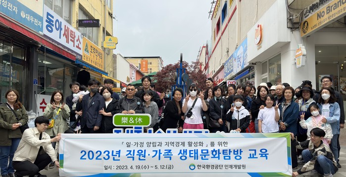 | ▲ 한국환경공단은 교육생에게 즐거운 추억과 함께 지역경제 활성화에도 기여할 수 있는 ‘2023년 직원‧가족 생태문화탐방 교육’을 충북 제천시 소재 한국환경공단 인재개발원에서 진행하고 있다. ‘제천시 전통시장 러브투어’에 참여한 교육생들이 기념촬영하고 있다(사진=한국환경공단 제공) |