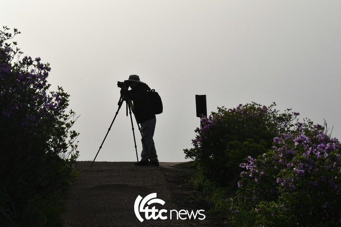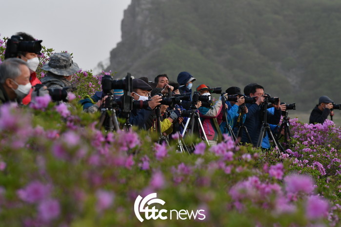 해돋이가 얼마 안 남았다. 사진동호인들은 철쭉 군락지를 향해 발걸음을 재촉한다. 종종걸음으로 10여 분가량 오르자 정상 부근에 철쭉 군락지가 펼쳐진다. 활짝 핀 철쭉 사이로 수 많은 사진작가들은 커다란 삼각대에 카메라를 올리고 동쪽 하늘을 주시한다. 해돋이를 함께하기 위한 탐방객들도 한 손에 스마트 폰을 들고 붉은 해가 솟아오르기를 기다리고 있다. 예보된 일출시간이 지나도 짙은 구름은 가실 줄 모른다. 뒤늦게 도착한 사람들도 철쭉 사이 촬영 포인트를 찾아 자리를 잡을 무렵 구름 위로 둥근 해가 떠올랐다.