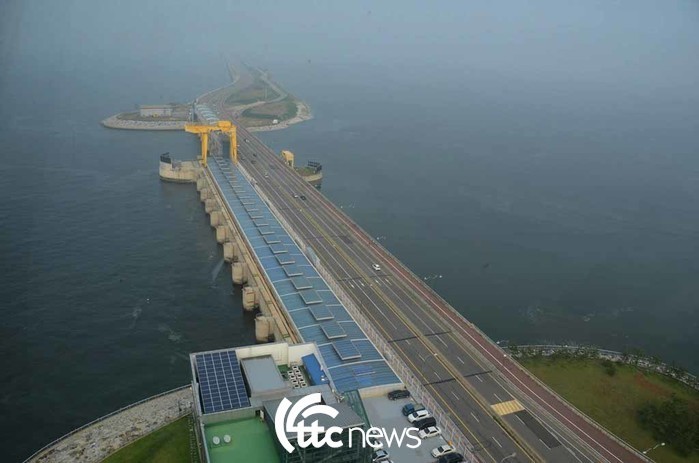| ▲ 시화조력발전소는 시흥시 인구 약 50만 명이 1년 간 사용할 수 있는 전력을 생산한다. 연간 86만 2000배럴의 유류 대체효과와 이산화탄소 31만 5천t의 저감 효과가 있다. 사진은 시화나래조력공원 달 전망대에서 내려다 본 시화조력발전소(티티씨뉴스 자료사진) |