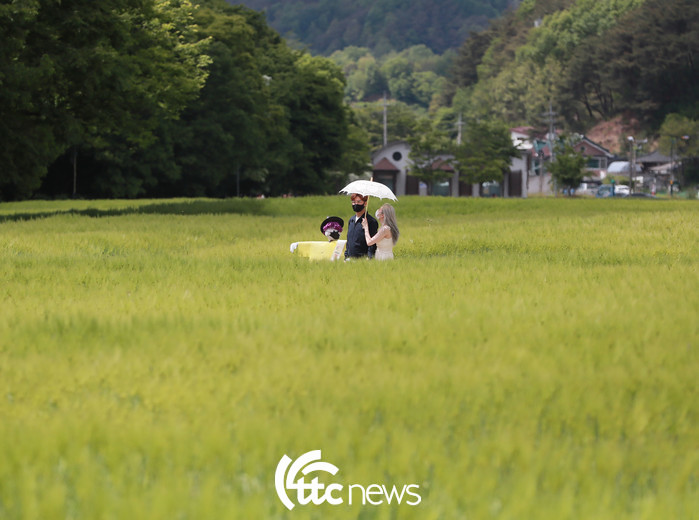 2일 경남 함양군 함양읍 상림공원 청보리 밭을 찾은 관광객이 활짝 핀 청보리를 배경으로 즐거운 시간을 보내고 있다.