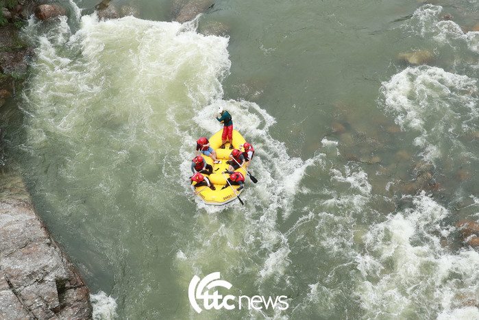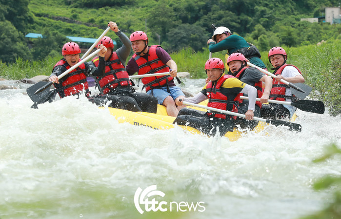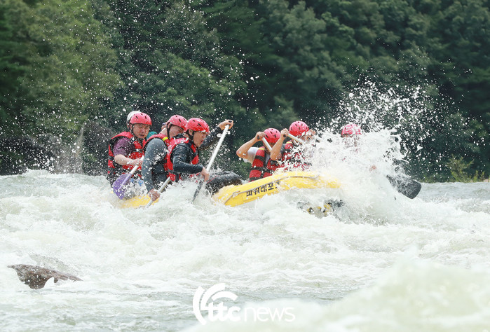| ▲ 11일 경남 함양군 휴천면 엄천강에서 래프팅 동호인들이 여름 물살을 가르며 래프팅을 즐기고 있다.(사진=함양군청 김용만 주무관 제공) |
