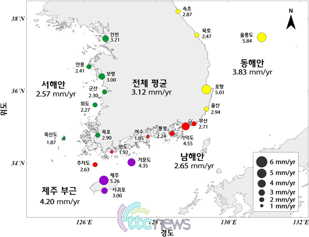 동해안의 경우 지난 30년간 평균 해수면 상승률이 연 3.83mm이지만, 최근 10년간 평균 해수면 상승률은 연 5.17mm, 남해안과 제주 부근의 30년간 평균 해수면 상승률도 각각 연 2.65mm 및 4.20mm였으나, 최근 10년간 평균 해수면 상승률은 각각 연 3.63mm 및 5.69mm로 나타났다.