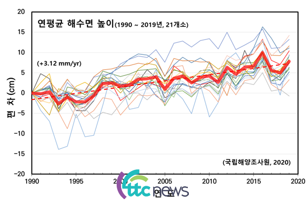 해양수산부 국립해양조사원은 14일 1990년 이래 30년간 우리나라 전 연안의 평균 해수면이 매년 3.12mm씩 높아진 것으로 밝혀졌다고 발표했다.
