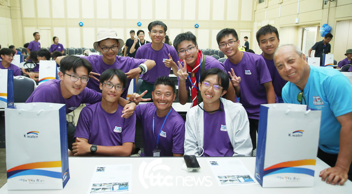 | ▲ 한국수자원공사가 준비한 환영 행사 진행 전 싱가포르 스카우트 대표단이 기념 촬영하고 있다. (사진=한국수자원공사 제공) |