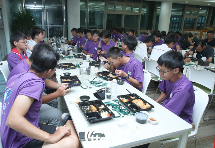 | ▲ 5일 싱가포르 스카우트 대표단이 한국수자원공사 인재개발원에 도착해 여장을 풀고 직원식당에서 특별히 준비한 도시락으로 저녁식사를 하고 있다.(사진=한국수자원공사 제공) |