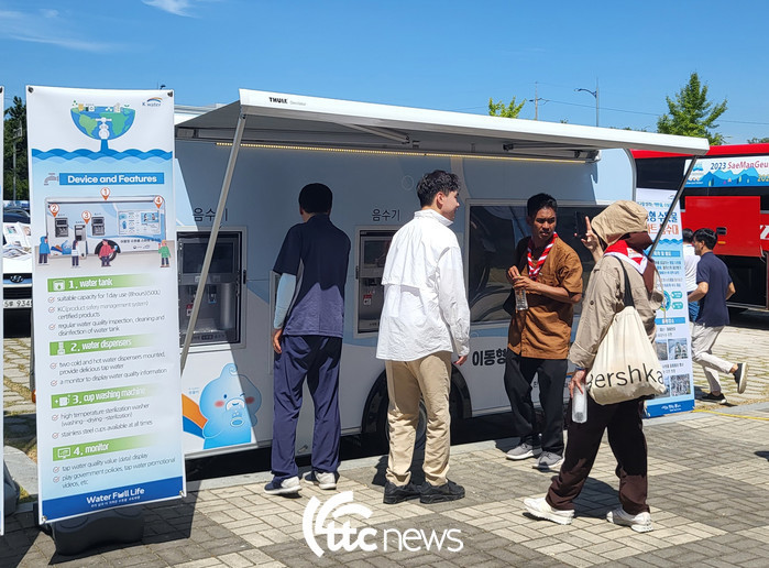 | ▲ 전북 부안군 새만금 일대에서 개최 중인 ‘2023 새만금 세계스카우트 잼버리’ 대회 참가자들이 한국수자원공사가 설치, 운영 중인 이동식 스마트 수돗물 음수대를 이용하고 있다.(사진=한국수자원공사 제공) |