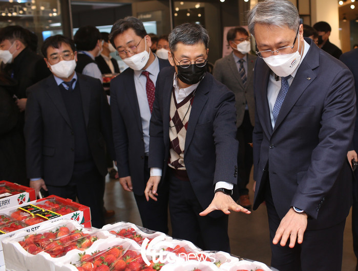 | ▲ 한국수자원공사는 7일 대전시 본사에서 딸기 농가와 함께 ‘제2회 물벗 나눔 장터, 딸기 팝업 스토어‘ 행사를 진행했다. 한국수자원공사 박재현 사장(사진 오른쪽)이 관계자의 설명을 듣고 있다.(사진=한국수자원공사 제공) |