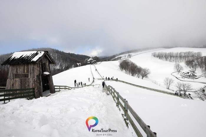 우리나라에서 눈이 제일 많이 내린다는 강원도 평창군 대관령면. 백두대간을 넘는 큰 관문이 있던 대관령(大關嶺) 양떼목장은 지금 한겨울 풍경을 연출하고 있다.