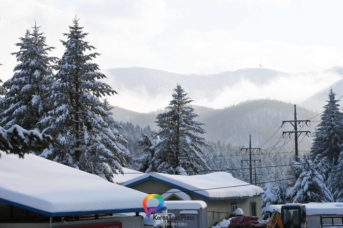 | ▲ 동화속 나라도 들어가는 비밀의 문 같은 대관령 양떼목장의 입구 대관령 마을 휴게소의 지붕과 나무 위에도 흰눈이 덮여 설국을 연출하고 있다. |