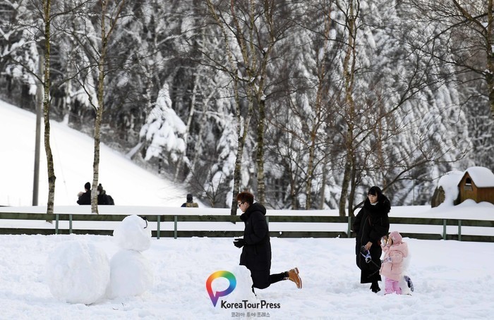 | ▲ 31일 대관령 양떼목장을 찾은 가족이 눈사람을 만들고 있다. |