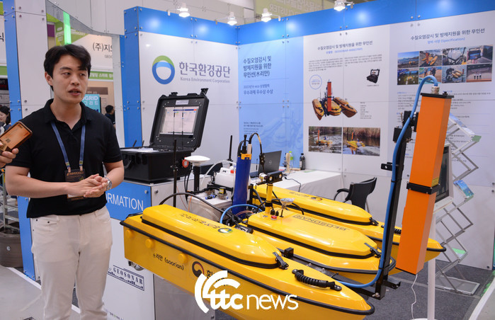 | ▲7일 서울 코엑스 A홀에서 열린 ‘ENVEX 2023 한국환경공단관에서 (주)지오소나 이희태 선임연구원이 ‘K-eco 상생협력 우수사례 경진대회’ 수상작품인 수질오염감시 및 방제지원을 위한 무인선 ‘수리안’ GEOSONAR-600의 기능과 역할을 설명하고 있다. |