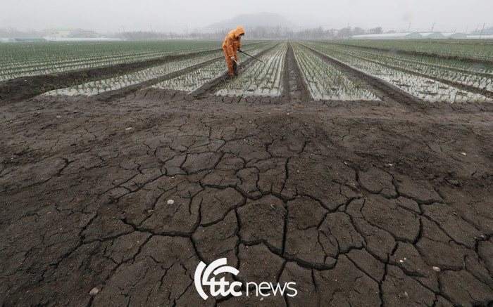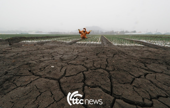 | ▲ 전국적으로 단비가 내린 13일 경남 함양군 함양군 한들에서 양파재배 농민이 내리는 단비를 맞으며 양파밭을 둘러 보고 있다. 앙파밭 앞 한쪽에 거북등처럼 갈라진 모습이 지난 겨울 가뭄이 극심했음을 보여주고 있다.(사진=함양군 김용만 주무관 제공) |