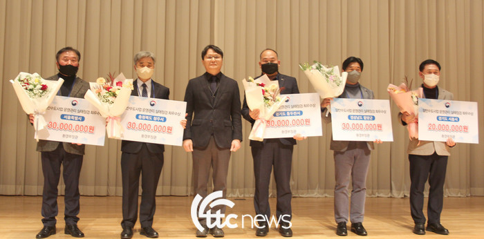 | ▲ 한국상하수도협회는 지난 8일부터 9일까지 양일간 제주도 휘닉스 제주 등에서 ‘2022년 수도시설 관리 워크숍을 개최했다. 이 자리에서 ‘2022년 일반수도사업 운영·관리 실태평가’ 최우수기관을 시상했다. 사진 왼쪽부터 서울특별시, 청주시, 환경부 진명호 과장, 동두천시, 시흥시, 함양군(사진=한국상하수도협회 제공) |