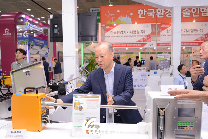 | ▲ 7일 서울 코엑스 A홀에서 열린 ‘ENVEX 2023 한국환경공단관에서 (주)두일테크 김홍록 부사장이 자사와 환경공단이 공동 개발한 ‘굴뚝 수분 자동 측정기'의 개발 배경과 원리를 설명하고 있다. |