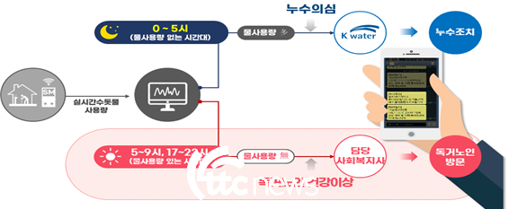 이 서비스는 물 사용량이 기존에 비해 급감하거나 장시간 사용이 없으면 이를 사고나 부상 등 위기 상황으로 판단하여 질병과 사고 등에 취약한 홀몸 노인, 장애인 가구의 돌봄에 활용되고 있다.