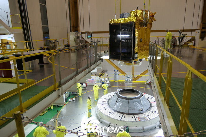 | ▲ 환경위성인 천리안위성 2B호는 2020년 2월 19일 남미 기아나 우주센터에서 발사된 정지궤도 환경위성은 현재 미세먼지 및 오존과 그 생성에 기여하는 대기오염물질 및 단기체류 기후변화 유발물질 등 14종을 관측하고 그 관측영상을 국립환경과학원 환경위성센터 누리집(https://nesc.nier.go.kr)에 실시간으로 공개하고 있다. 사진은 천리안위성 2B호의 발사전 점검 모습(사진=항공우주연구원 제공) |