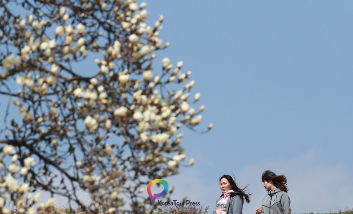 전국에 태풍급 강풍이 불며 강풍 특보가 내린 19일 춘분을 하루 앞두고 경남 함양군 함양읍 고운체육관 옆에 심어진 목련꽃이 활짝 피었다. 강한 봄바람 맞으며 시민들이 목련꽃 그늘 아래를 산보하고 있다.