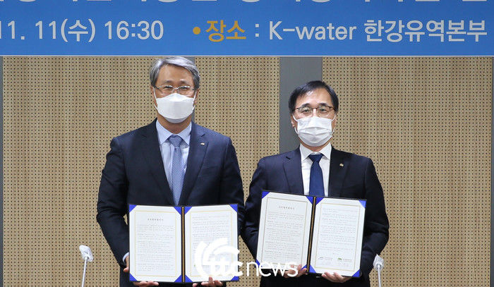 | ▲ 박재현 한국수자원공사 사장(왼쪽)과 이청룡 한국광해관리공단 이사장이 11일 경기도 과천에 있는 한국수자원공사 한강유역본부에서 수질안전 및 수생태계 보전을 목표로, 댐 상류에 위치한 탄광 유출수의 댐 내 유입 저감을 위한 광해방지사업 업무협약을 체결한 후 기념촬영하고 있다.(사진= 한국수자원공사 제공) |