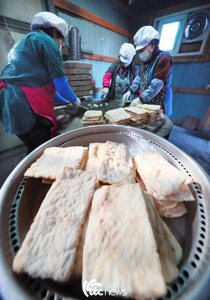 13일 경남 함양군 지곡면 개평한옥마을 한과작업장에서 마을 할머니들이 ‘자갈한과’를 만들고 있다. 함양 명물 ‘자갈한과’는 뜨거운 장작불에 달군 자갈 위에서 구워 만든 한과를 이른다.